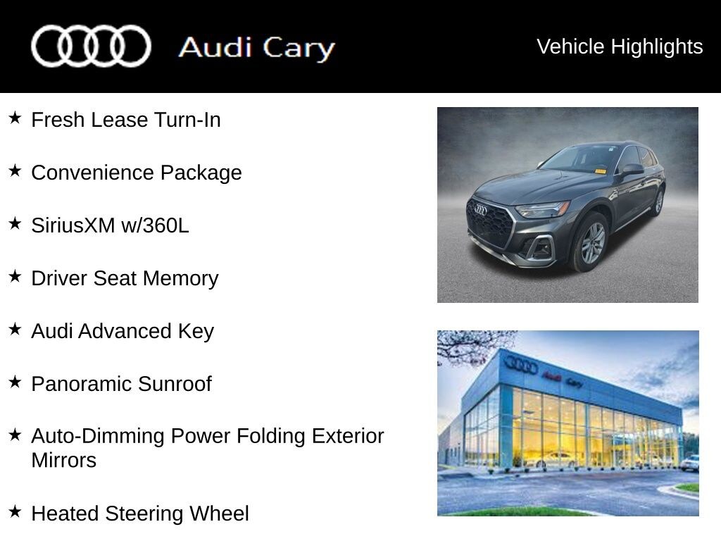Daytona Gray Pearl Effect 2023 Audi Q5 45 S line Premium quattro 7-Speed Automatic S tronic 2.0L Turbocharged quattro CARFAX One-Owner. Clean CARFAX. Fresh Lease Turn-In, Black w/Leather Seating Surfaces, Audi Advanced Key, Auto-Dimming Power Folding Exterior Mirrors, Convenience Package, Driver Seat Memory, Heated Steering Wheel, Panoramic Sunroof, SiriusXM w/360L.